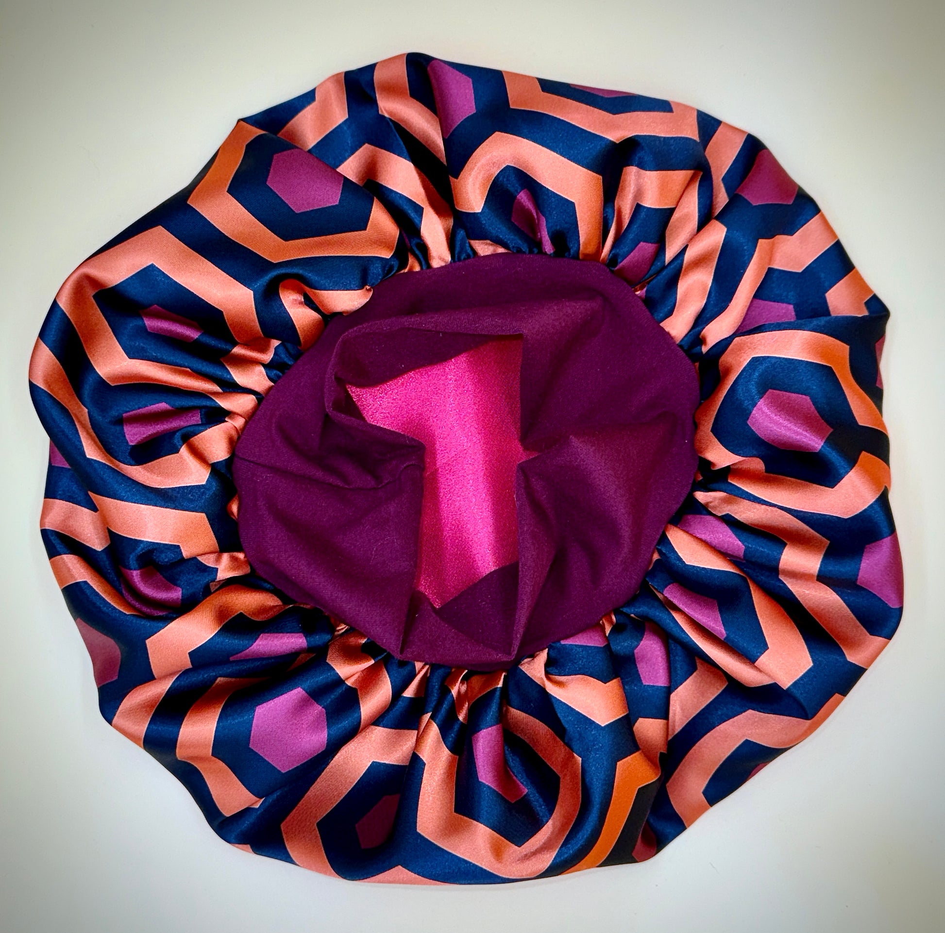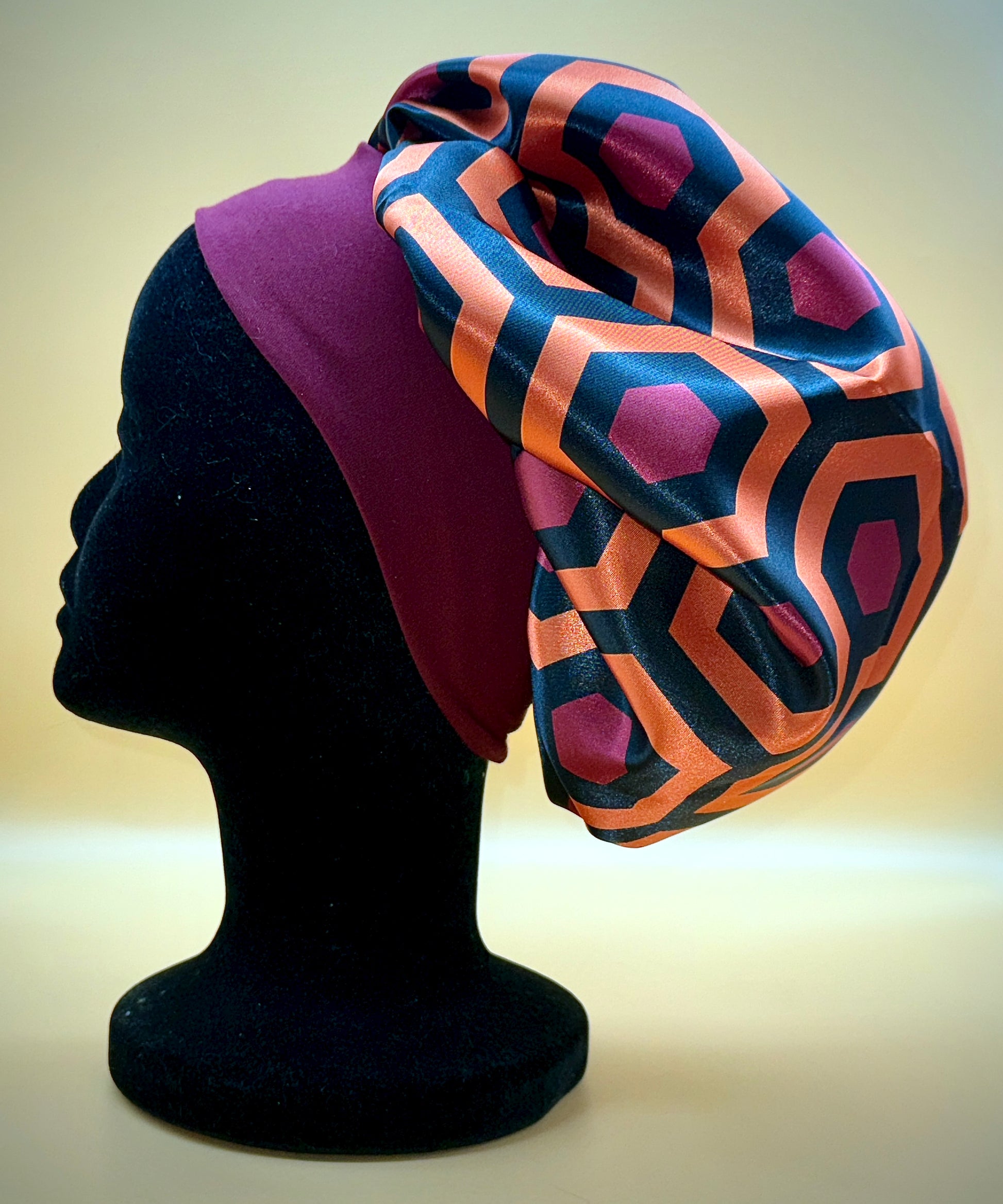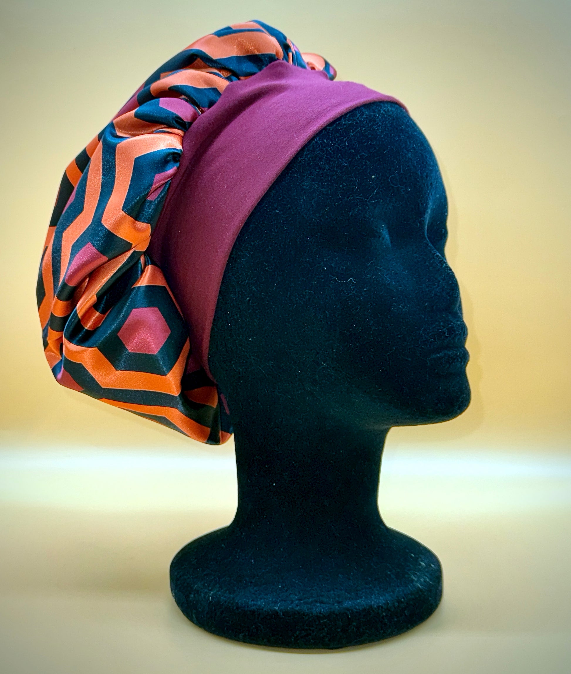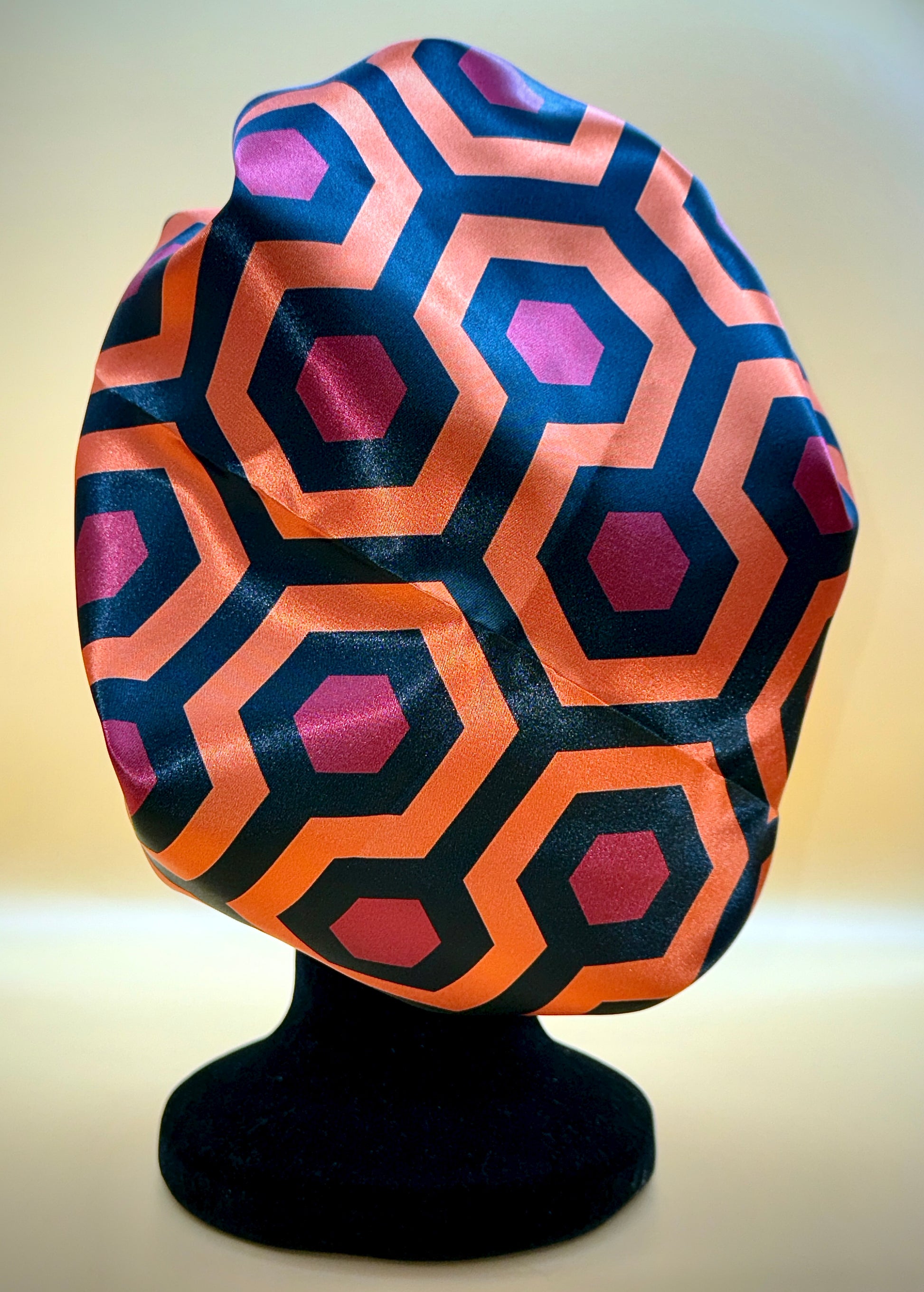🩸🪓 REDRUM 🪓🩸 A satin bonnet perfect for that horror movie fan in your life! This unique satin bonnet features a fun print inspired by the iconic Stanley Kubrick film. It also features a wide cotton spandex jersey headband in maroon, and a shiny satin lining in red, for extra slip against your hair. 🥶