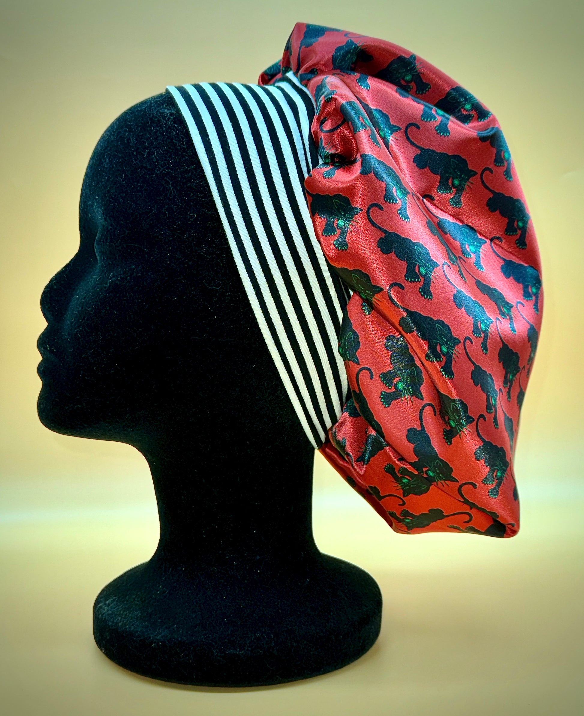 This satin bonnet features a green and black panther print on red, and also features a wide, comfortable black-and-white striped headband in eco-friendly bamboo jersey. Lined in shiny green satin for extra care against your hair at night.
