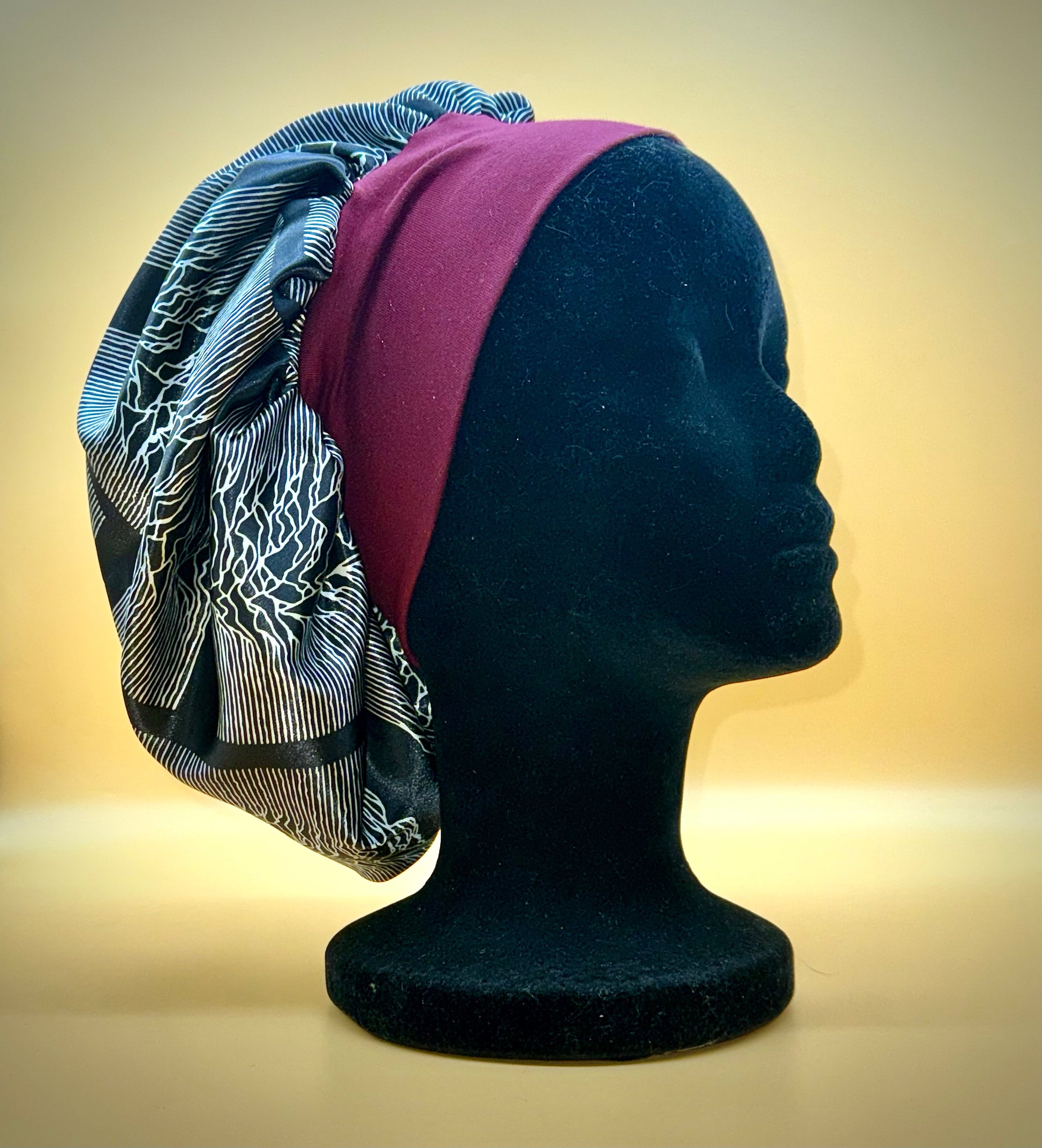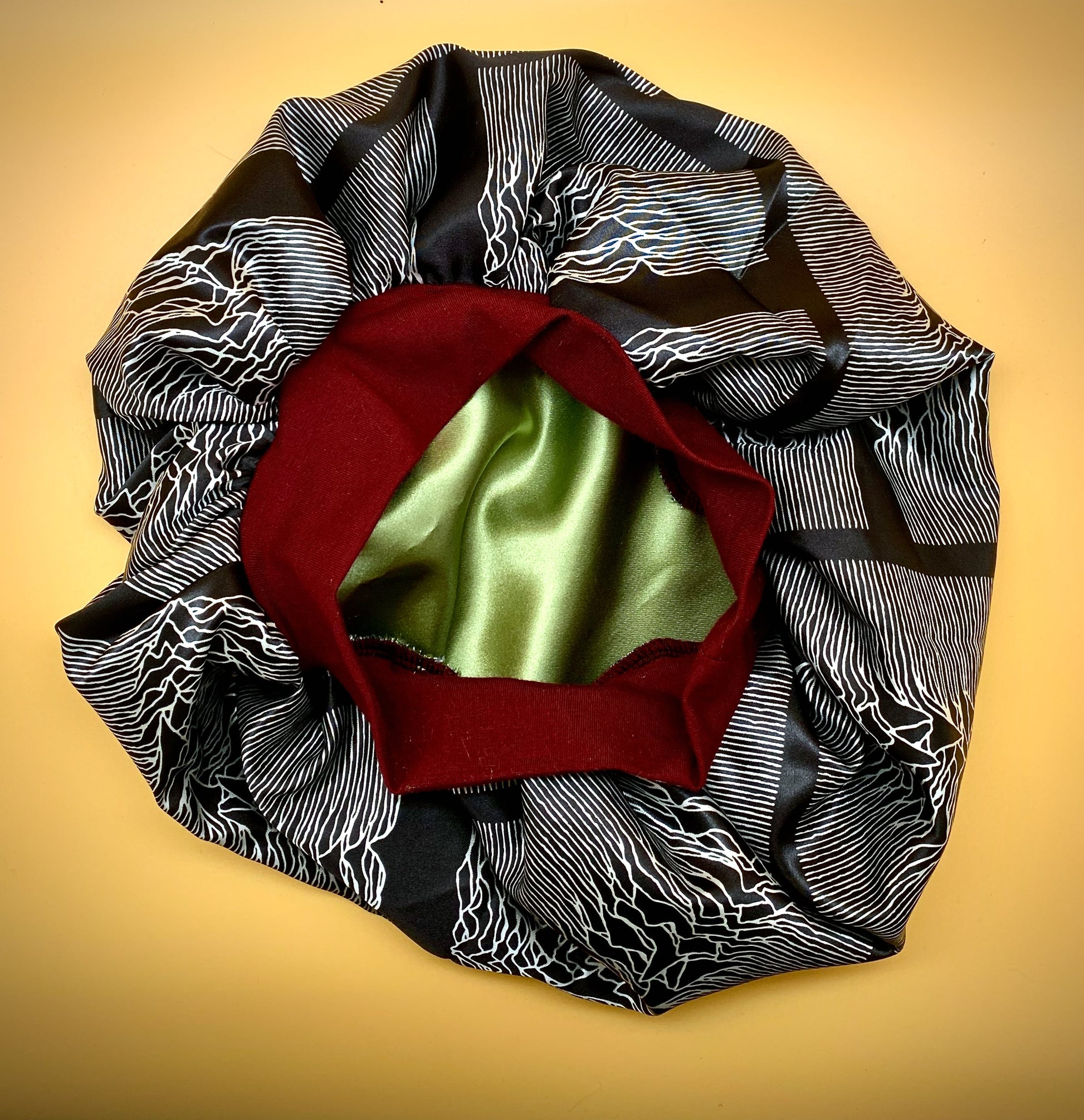 The perfect gift for that alternative music lover in your life! This satin bonnet features a print inspired by one of music's most famous album covers. Also features a wide and comfortable cotton spandex jersey headband in maroon that will keep your bonnet on all night. Lined in gorgeous sage green satin!